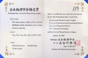 広島大学で開催された第80回日本物理学会年次大会で、第30回(2025年)日本物理学会論文賞の表彰式がで行われました。本賞は、独創的な論文の発表により、物理学の進歩に重要な貢献をした研究者の功績をたたえるために制定された賞です。